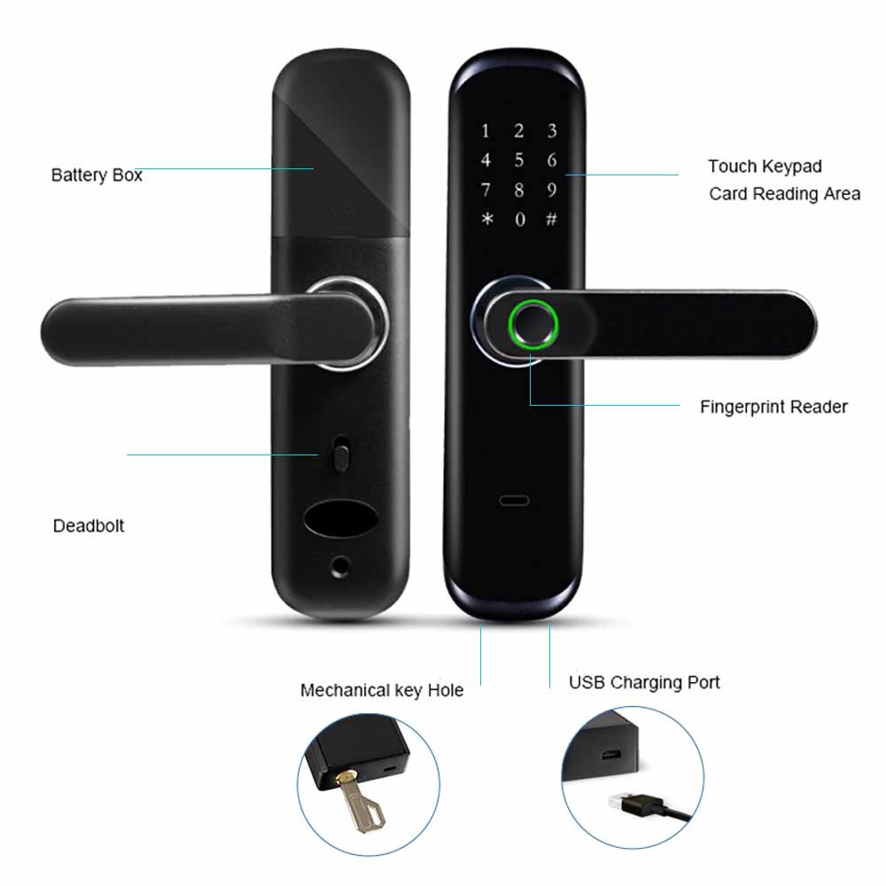 มีระบบจัดการที่สะดวกและ 6 วิธีในการปลดล็อก: การปลดล็อกด้วยลายนิ้วมือ, การปลดล็อก BLE APP, การปลดล็อก WiFi ระยะไกล,ปลดล็อกรหัสผ่าน/ PIN, ปลดล็อกการ์ดและปลดล็อคกุญแจเครื่องกล มันจะตอบสนองทุกความต้องการของคุณเกี่ยวกับล็อคอัจฉริยะด้วยการจัดการแอพขั้นสูงผ่าน WiFi หรือ BLE เพื่อเชื่อมต่อล็อคอัจฉริยะกับสมาร์ทโฟนของคุณและคุณสามารถจัดการล็อคประตูอัจฉริยะของคุณได้ทุกที่ทุกเวลา